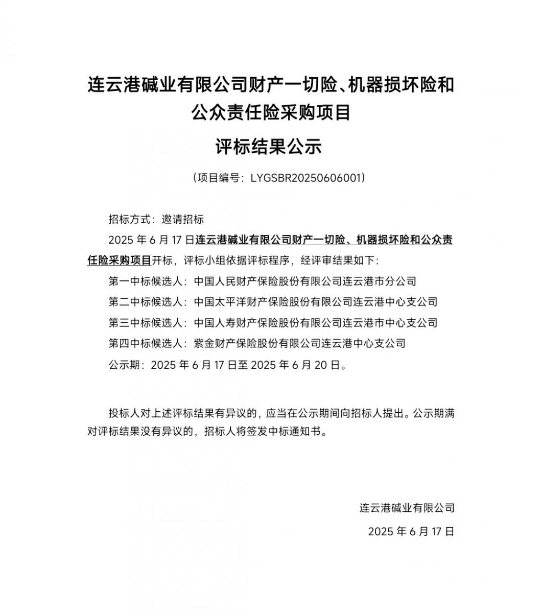 連云港堿業(yè)有限公司財產(chǎn)一切險、機器損壞險和公眾責任險采購項目評標結(jié)果公示