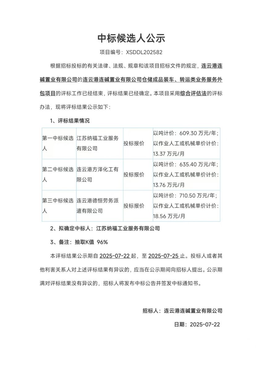 連云港連堿置業(yè)有限公司倉儲成品裝車、轉(zhuǎn)運類業(yè)務(wù)服務(wù)外包項目中標候選人公示